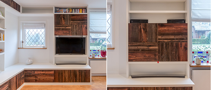 Boekenkast met ingebouwde beamerscherm en TV. Fronten gemaakt van oud hout, afkomstig van Oostenrijkse chalets.